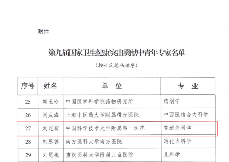 “国家卫生健康突出贡献中青年专家”称号授予在卫生健康系统作出突出贡献和杰出成就的中青年专业人才。入选第九届“国家卫生健康突出贡献中青年专家”的101位同志是近年来卫生健康系统的优秀代表,为推动卫生健康事业发展、抗击新冠肺炎疫情、决战脱贫攻坚作出了突出贡献。刘连新教授是此次安徽省唯一获选专家。