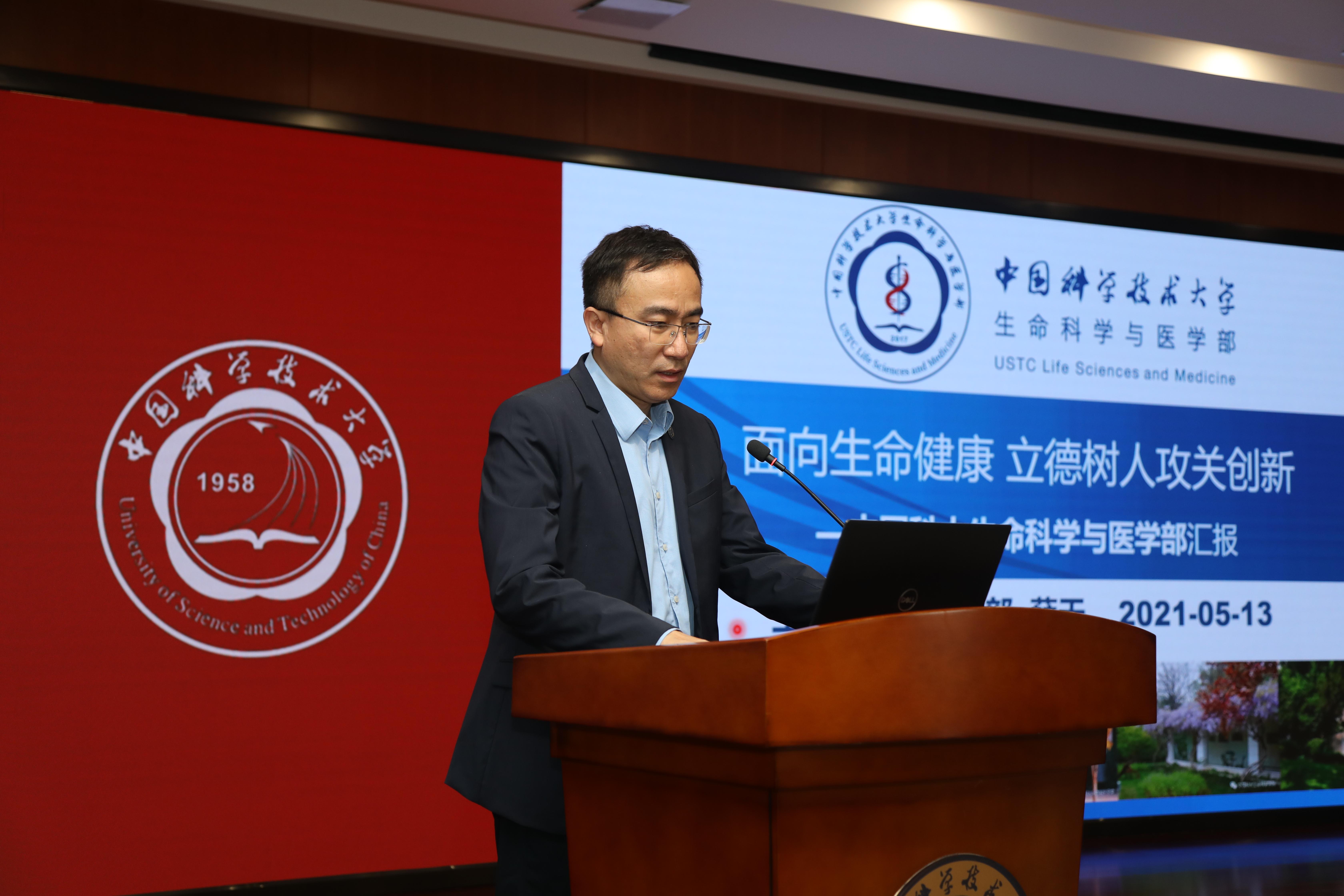 生命科学与医学部执行部长薛天以《面向生命健康 立德树人攻关创新》为题,做中国科大生命科学与医学部工作汇报。他简要介绍了中国科大生命科学与医学部的建制、历史沿革、战略定位、基本定位及架构,并围绕潜心立德树人、执着攻关创新两方面,介绍了科大新医学的教学理念、学位学科与人才培养体系,以及国家双一流建设学科、近五年的科研项目与成果等,重点阐述了生医部未来的发展蓝图和中国科大抗疫科研攻关情况。
