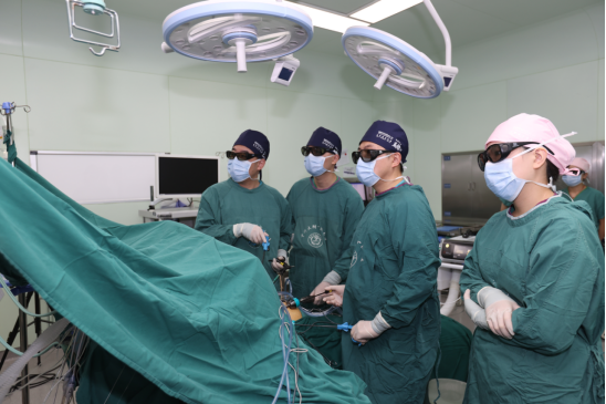 ▲肝脏外科主任马金良进行荧光腹腔镜S8段肿瘤切除术演示