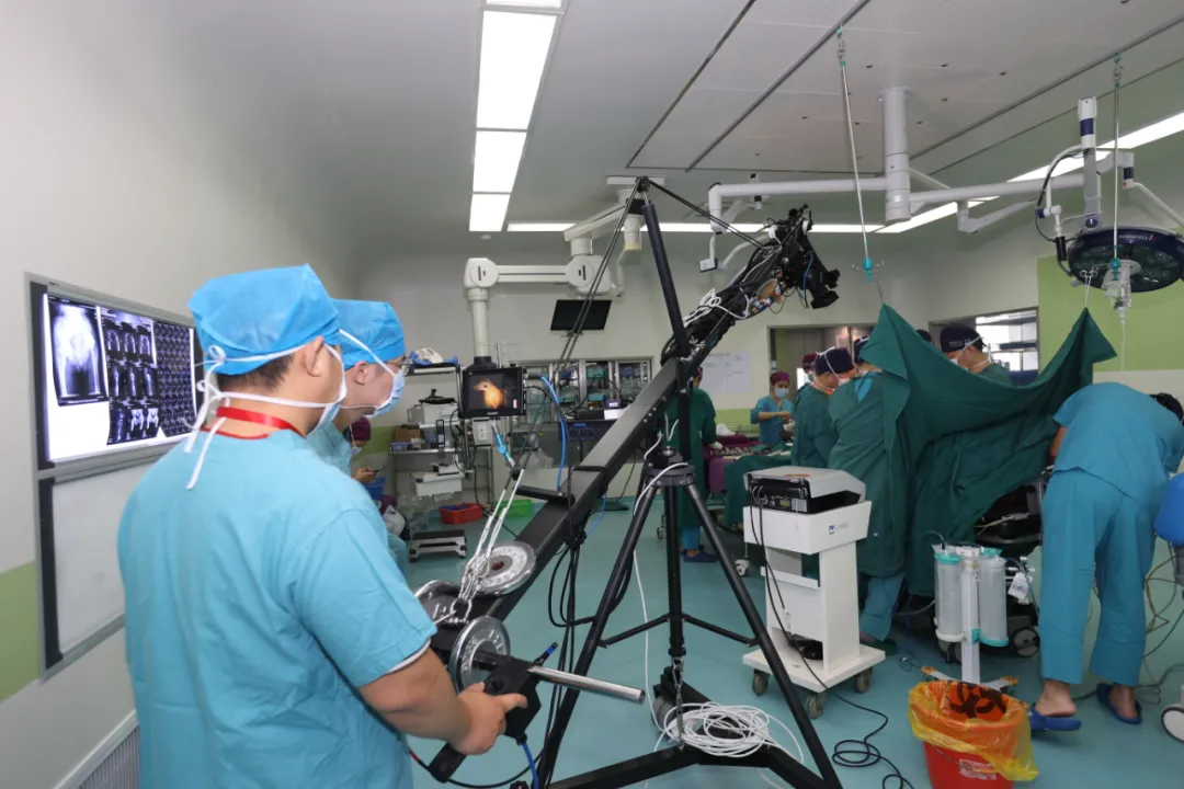 ▲骨科脊柱外科主任张文志进行显微镜辅助下经椎间孔腰椎椎间融合术(MIS-TLIF)演示