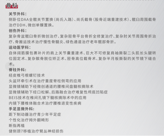 骨科关节、脊柱、创伤、运动医学、手足外科5个亚专科,带来了直接前路全髋关节置换术、全膝关节置换术、肩关节镜下肩峰成型+肩袖修补术、膝关节镜下关节清理+PCL重建(LARS)+ACL重建+内侧副韧带修补术、显微镜辅助下经椎间孔腰椎椎间融合术(MIS-TLIF)、超声骨刀辅助下胸椎椎板切除减压+钉棒内固定术、股骨转子间骨折闭合复位髓内钉内固定术、改良Chevron截骨+腓肠肌松解术治疗中重度拇外翻等近20台手术演示。