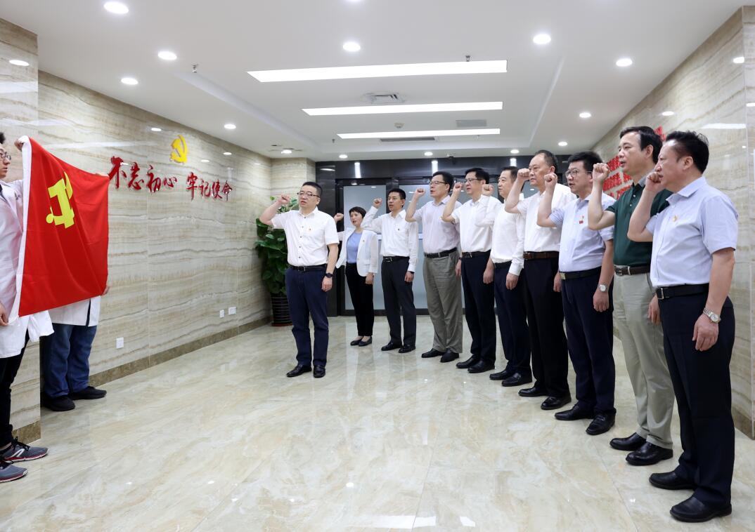 庆祝大会开始前,我院党委中心组在鲜红的党旗前重温入党誓词。在党委书记刘连新的领誓下,党员院领导庄严地举起右手,用饱满的激情、响亮的声音,重温当年的决心和信念。刘连新表示,要在重温入党誓词中感悟初心、坚定初心、以实际行动践行为人民谋幸福,守护百姓健康的使命。