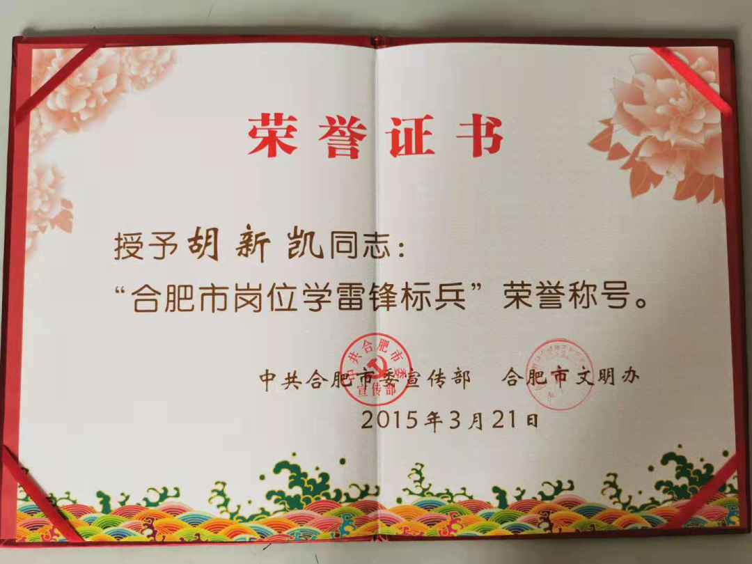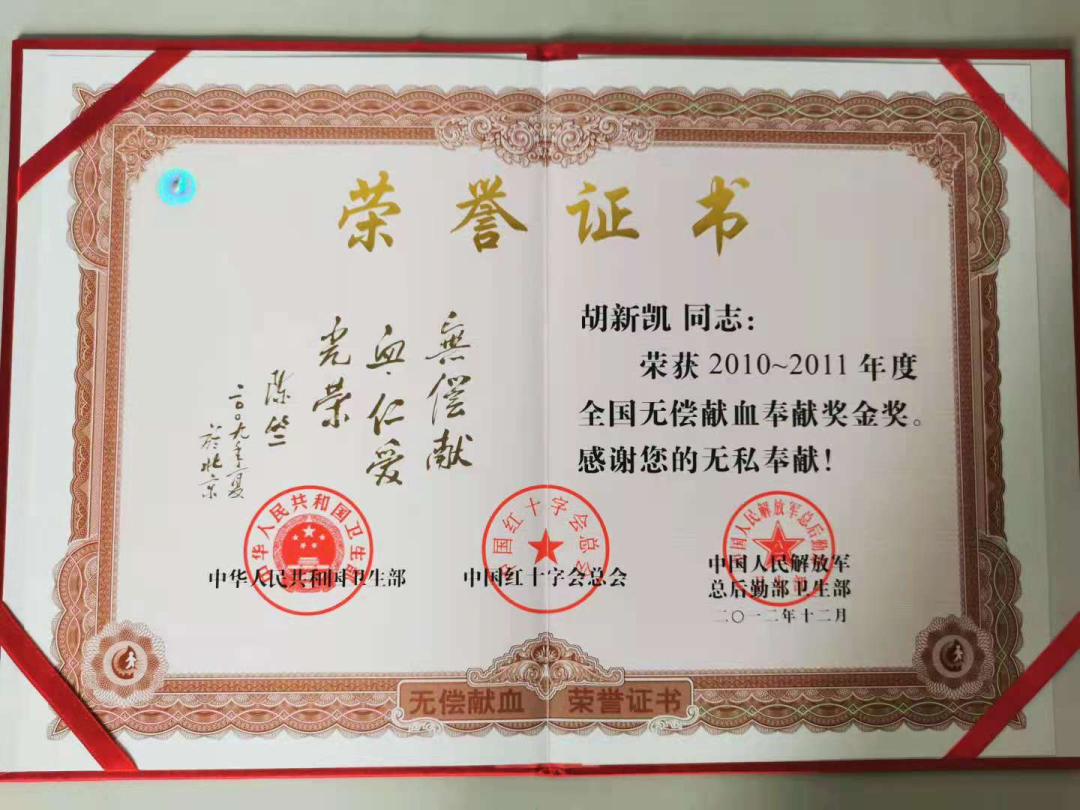 参加工作20年来,胡新凯已无偿献血58次,多次获得“全国无偿献血奉献奖金奖”,2015年荣获“合肥市岗位学雷锋标兵”称号。