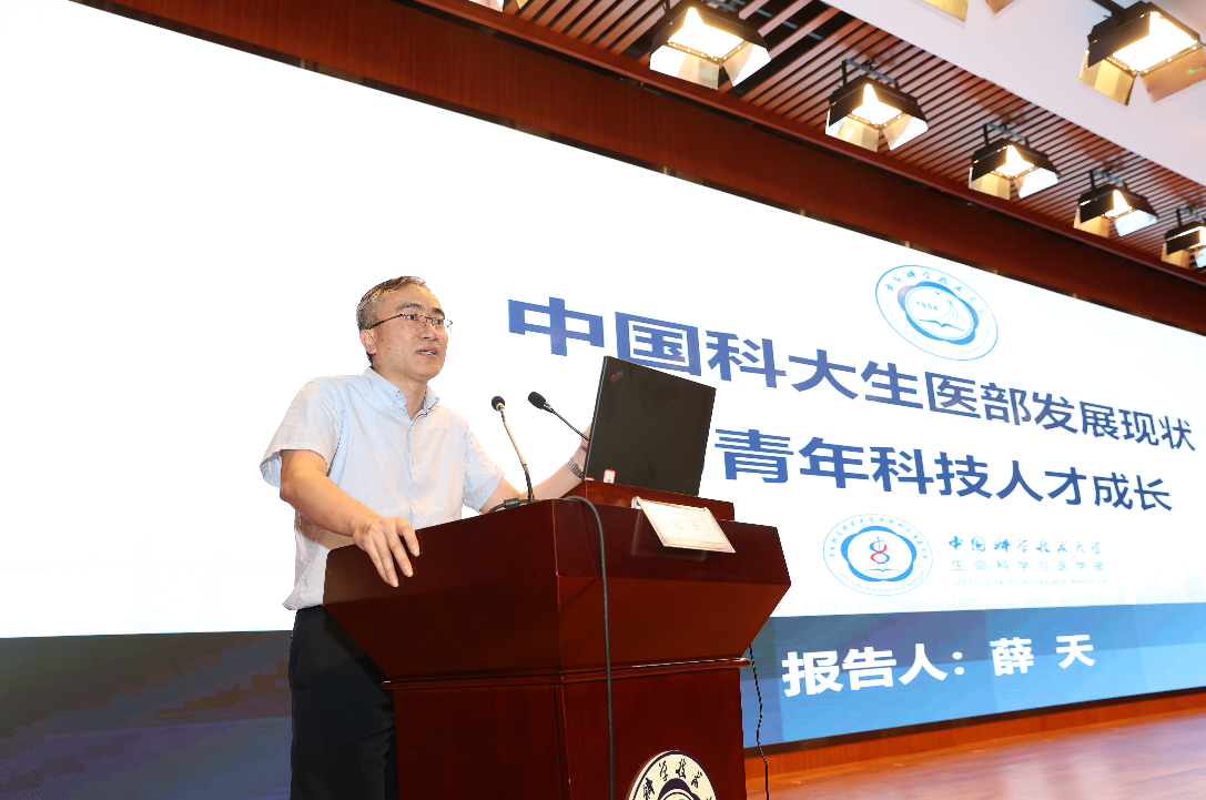 中国科学技术大学生命科学与医学部执行部长薛天为大会带来《中国科大生医部发展现状与青年科技工作者成长》报告。介绍了中国科大生医部的创建背景、建设现状及其发展使命。并从个人奋斗、团队合作、学科交叉三个方面分享了青年科技人才成长要素。报告内容为创新推进科大新医学发展指明了方向。