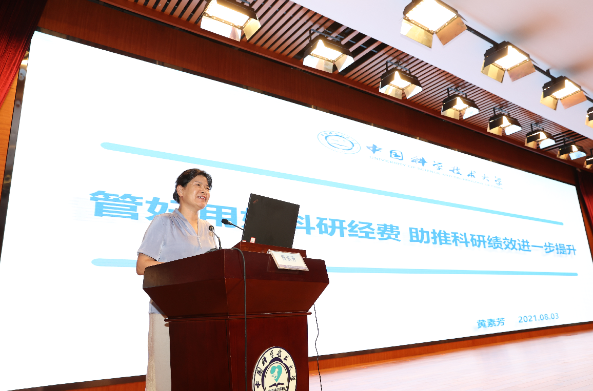中国科学技术大学党委常委、总会计师黄素芳在《管好用好科研经费,助推科研绩效进一步提升》主题报告上细致介绍了科研经费管理使用政策、科研综合绩效评价工作以及经费使用红线和高发问题。
