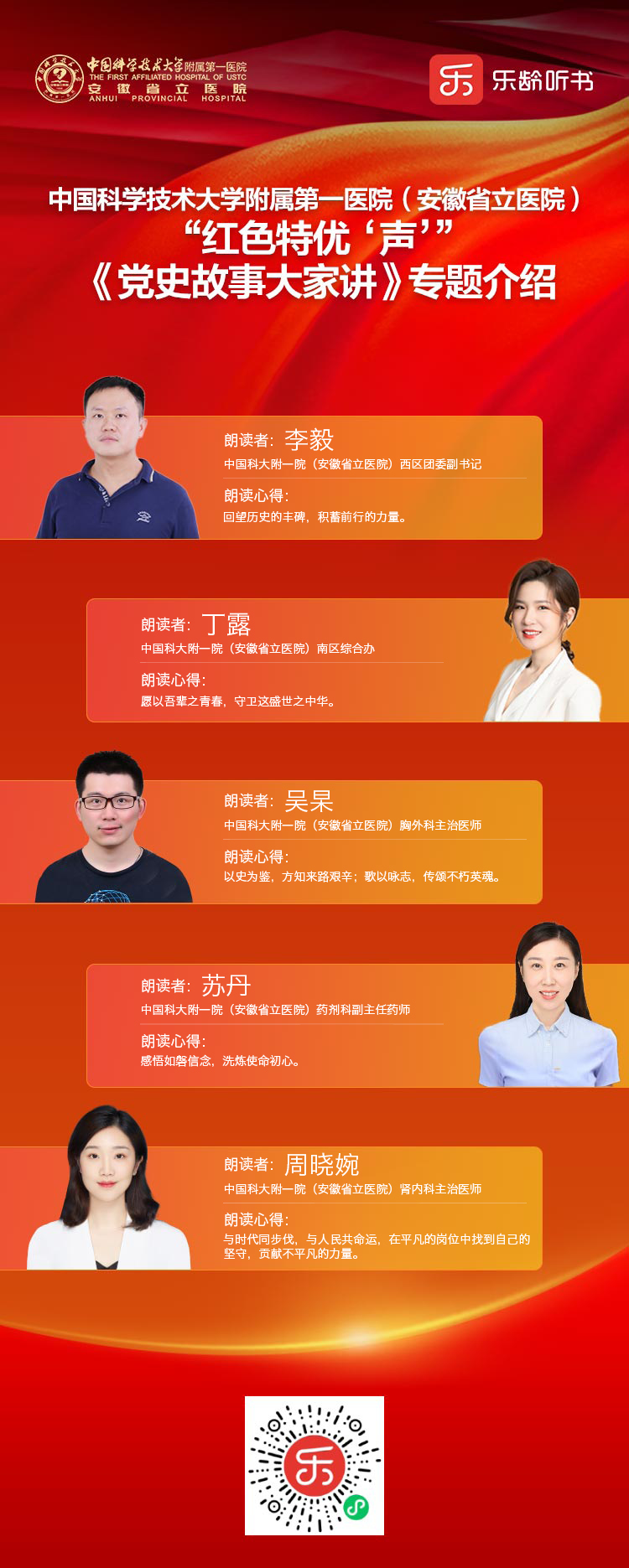 百年征程波澜壮阔,百年初心历久弥坚。在中国共产党成立100周年之际,为丰富党史学习教育形式,激励全体干部职工学党史、知党情、跟党走,我院联合安徽科学技术出版社,开展《党史故事大家讲》专题活动,通过医院官方微信推送,并在安徽科技出版社“乐龄听书”栏目上线播出。