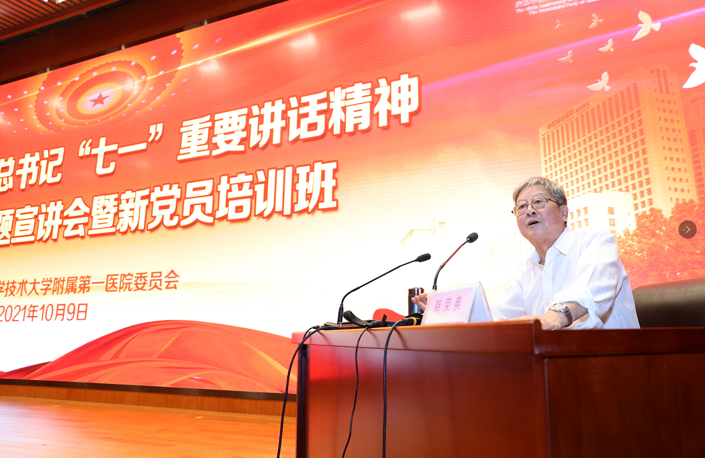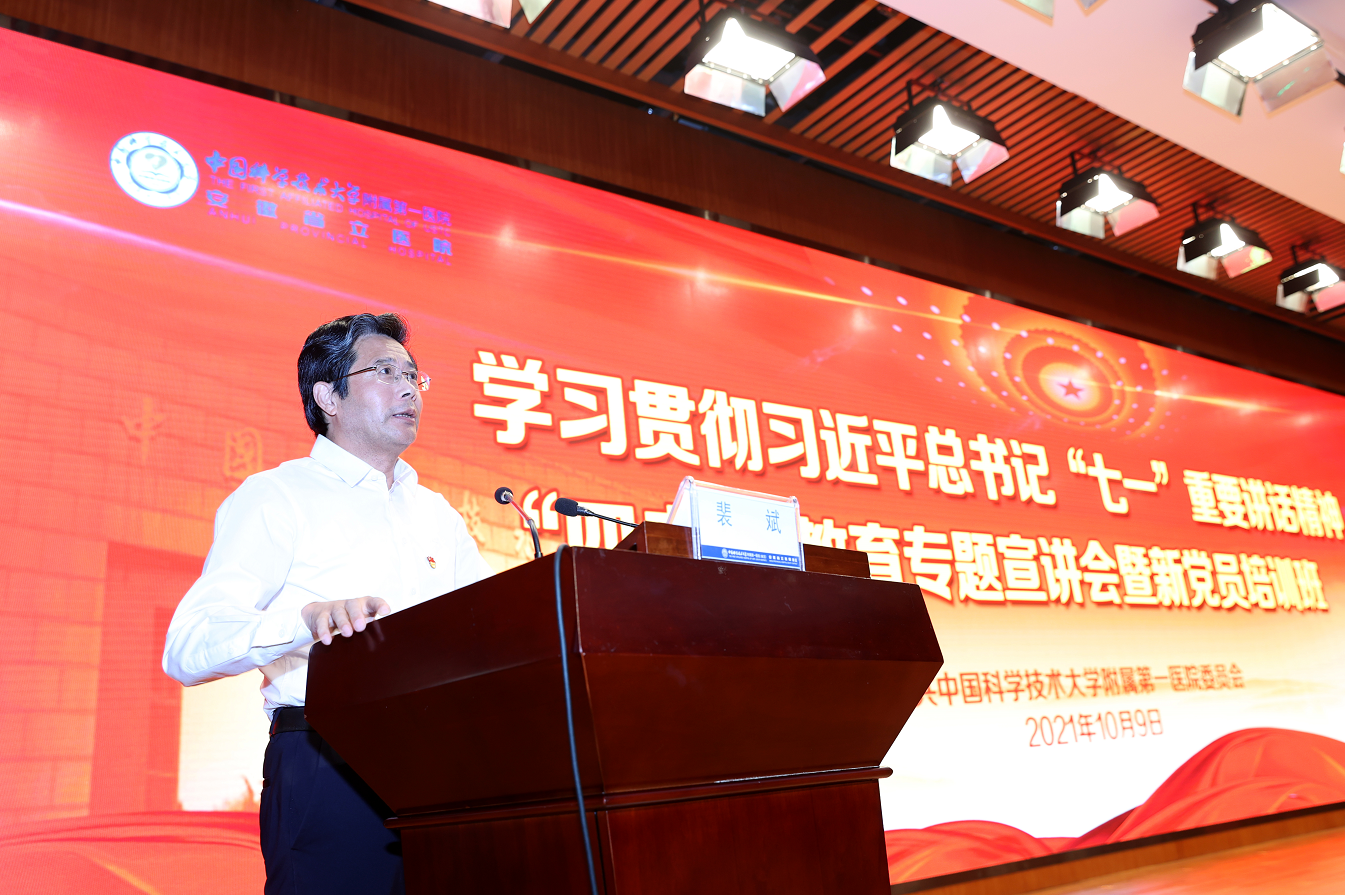 会上,中国科大学习贯彻习近平总书记“七一”重要讲话精神专题宣讲团成员、大学原副校长韩荣典教授作专题宣讲。韩荣典教授结合党史和校史,通过分享老一辈科学家鲜活生动的小故事,畅谈了个人奋斗与国家发展的辩证关系,阐述了中国科大在不断追求卓越过程中形成的红专历史和精神文化,展现了一代代科大人勇立潮头、科教报国的家国情怀,表达了新征程下对大学“双一流”建设和我院“一流医院”建设的殷切希望。