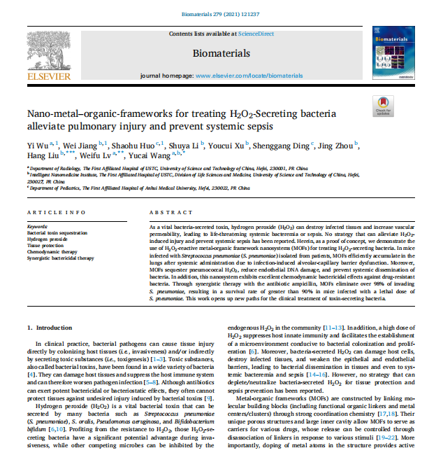 近日,中国科大附一院(安徽省立医院)影像科吕维富、王育才团队报告了一种过氧化氢毒素响应性药物载体,可靶向清除感染部位的细菌毒素和致病菌,从而缓解感染组织损伤和细菌扩散,为临床治疗分泌毒素的细菌开辟了新途径。研究成果以“Nano-metal–organic-frameworks for treating H₂O₂-Secreting bacteria alleviate pulmonary injury and prevent systemic sepsis”为题,发表在权威期刊《Biomaterials》(IF:12.4)上。
