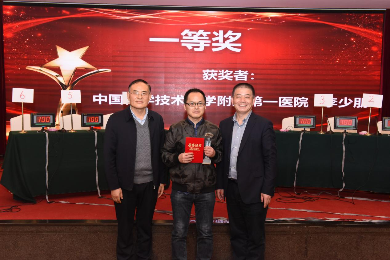 竞赛形式由理论考试、报告书写、病例思辨技能三部分组成。竞赛为期一个月,在11月9日的初赛中,皖中赛区60余名医生参赛,李少朋医生代表一举获得了皖中赛区的总成绩和理论考试第一名,顺利取得进入全省决赛的资格。在19日的安徽省影像诊断技能竞赛全省总决赛中,18名竞赛选手同台竞技、角逐总冠军,经过七个小时的激烈比赛,李少朋医生在各赛区的强有力竞争者中脱颖而出,最终取得大赛一等奖的好成绩。安徽省影像诊断质控中心主任余永强教授、我院影像中心吕维富主任为李少朋颁奖并表示祝贺。