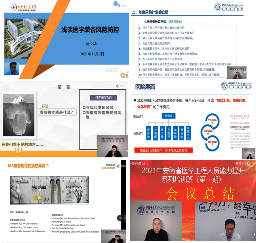 11月27日,由安徽省医学装备质量控制中心牵头,联合宿州、淮北、蚌埠、亳州、阜阳、淮南、合肥、滁州市医学装备质控中心共同组织的第一期安徽省医学工程能力提升培训班顺利召开。我院副院长孙敬武参加开幕式。本次培训班采取线上培训模式,近6000余人进行了线上聆听。
