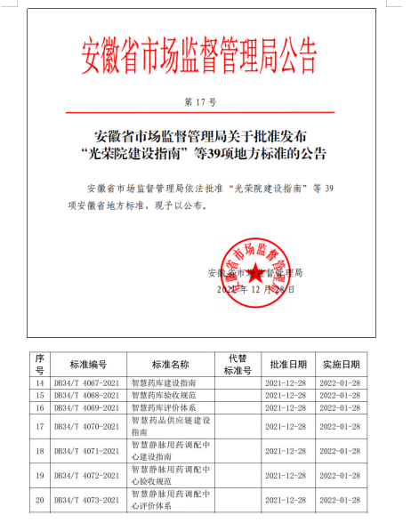 在安徽省卫生健康委员会和安徽省市场监督管理局的支持下,12月28日,我院负责牵头撰写的《智慧药库建设指南》(标准编号:DB34/T 4067-2021)、《智慧药库验收规范》(标准编号:DB34/T 4068-2021)、《智慧药库评价体系》(标准编号:DB34/T 4069-2021)、《智慧药品供应链建设指南》(标准编号:DB34/T 4070-2021)、《智慧静脉用药调配中心建设指南》(标准编号:DB34/T 4071-2021)、《智慧静脉用药调配中心验收规范》(标准编号:DB34/T 4072-2021)、《智慧静脉用药调配中心评价体系》(标准编号:DB34/T 4073-2021)等7项地方标准由安徽省市场监督管理局正式发布。