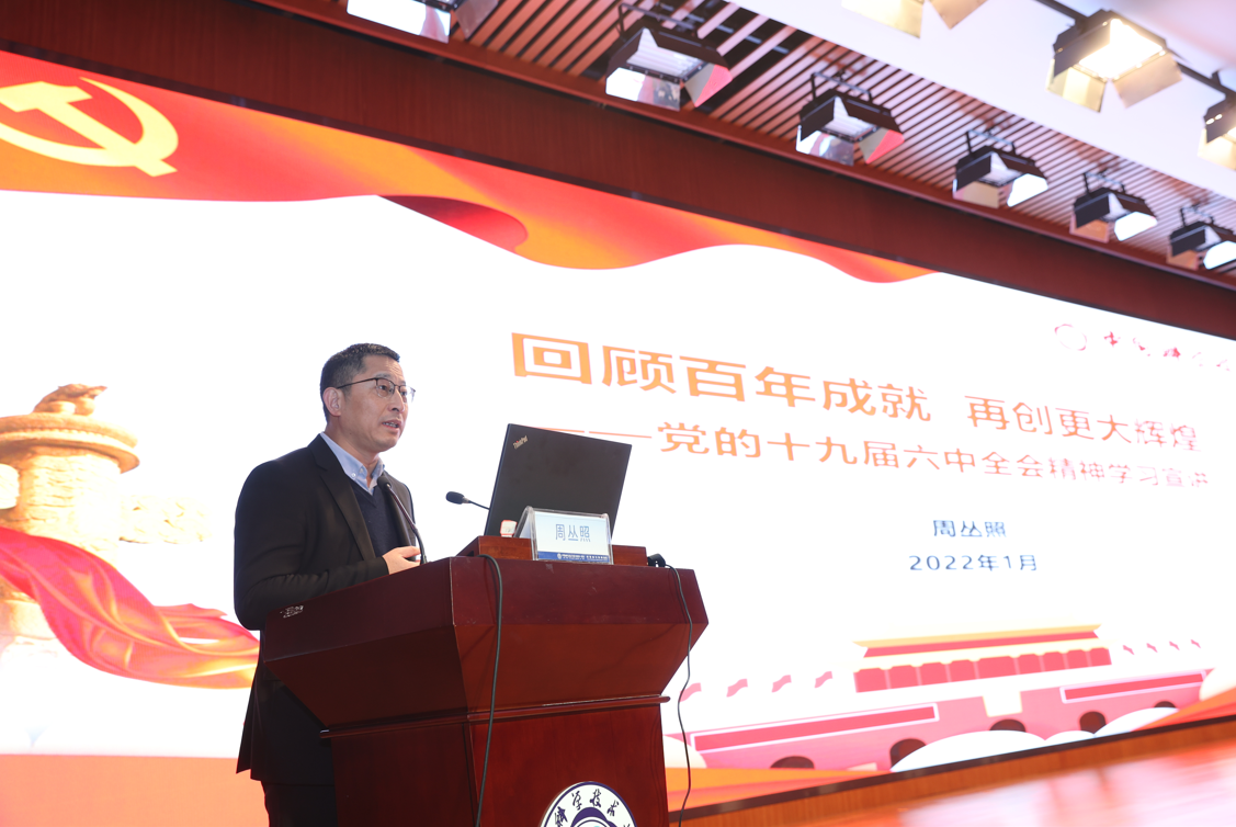 为深入学习贯彻党的十九届六中全会精神,全面推进党史学习教育走深走实,推动兴起学习全会精神的热潮,根据大学党委统一部署,1月10日下午,院党委在南区会议中心召开学习贯彻党的十九届六中全会精神宣讲报告会,校学习贯彻党的十九届六中全会精神宣讲团成员、党委常委、副校长周丛照作题为《回顾百年成就再创更大辉煌》的专题宣讲。院领导班子成员和各级党组织书记参加会议。院党委书记刘连新主持会议。