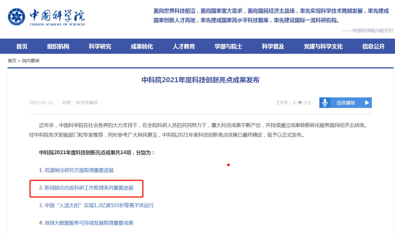 2022年1月12日,经中国科学院有关职能部门和专家推荐,同时参考广大网民意见,中国科学院2021年度科技创新亮点成果最终确定并发布。