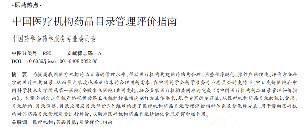 由中国药学会药学服务专业委员会主任委员刘丽宏教授牵头,中国药学会药学服务专业委员会组织联合六大家医疗机构共同执笔,完成了《中国医疗机构药品目录管理评价指南》。该指南于2022年3月5日在《中国药房》上发表,中日友好医院药剂科刘丽宏教授和我院药剂科沈爱宗教授为本指南的共同通讯作者。