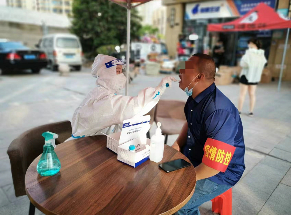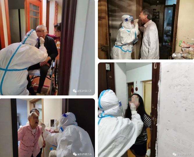 完成核酸点的采样工作后,在志愿者引导下,“大白”们上门为当天行动不便和居家隔离等特殊人群提供快速高效的采样,她们穿着密闭的防护服,分秒必争穿梭于楼宇之间,每次采样完成后就听到居民说:“太暖心了,谢谢你们!”。