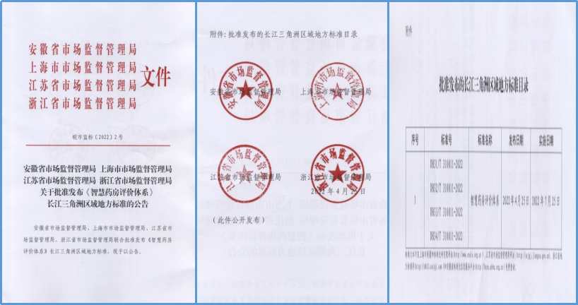 在长江三角洲区域三省一市市场监督管理局和卫生健康委员会的支持下,我院负责牵头撰写的长三角区域地方标准《智慧药房评价体系》(标准编号:DB31/T 310011-2022、DB32/T 310011-2022、DB33/T 310011-2022、DB34/T 310011-2022)正式获批发布。