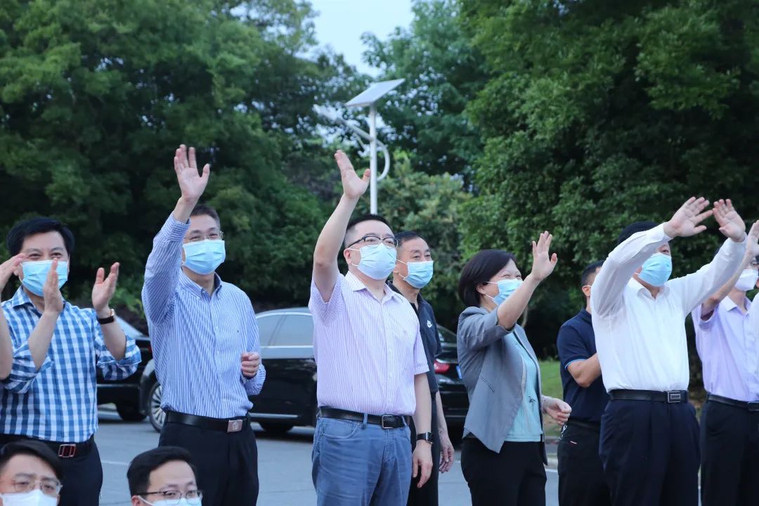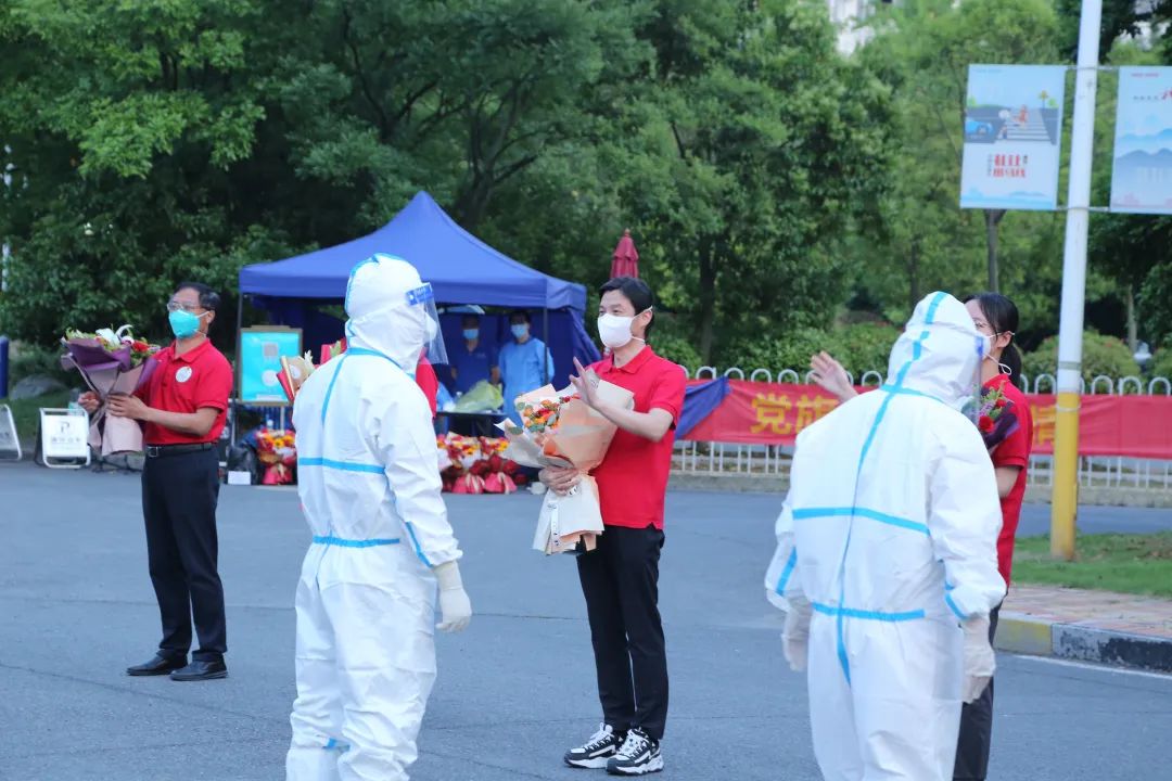 5月22日下午,安徽省援沪医疗队总领队杨绪斌,副总领队汪天平、邵东华等,迎接我院方舱院区最后一班医护人员出舱