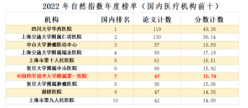 2022年自然指数(Nature Index)年度榜单日前揭晓,我院论文计数得分47,分数计数得分15.74,位列全球医疗机构第45位,中国医疗机构第7位。