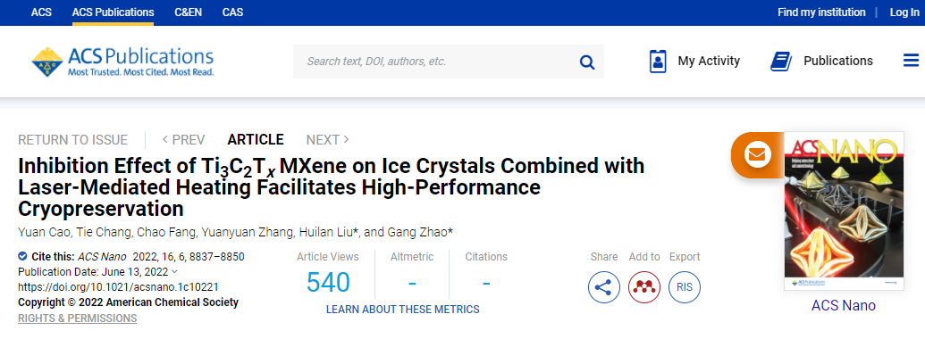 近日,由中国科学技术大学附属第一医院刘会兰主任团队和中国科学技术大学赵刚教授团队合作研究发现,Ti3C2TxMXene纳米材料的多重冰晶抑制效应,能有效提高干细胞-水凝胶构建物低温保存效果。相关研究成果以“Inhibition Effect of Ti3C2Tx MXene on Ice Crystals Combined with Laser-Mediated Heating Facilitates High-Performance Cryopreservation”为题发表于国际权威期刊ACS Nano(IF=15.881)。
