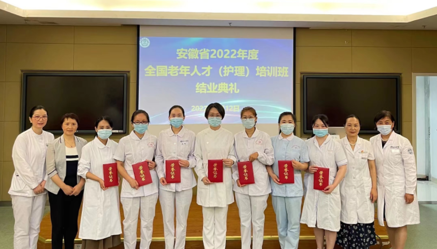 7月12日上午,为期一个月的安徽省2022年度全国老年医学人才(护理)培训班一期在我院举行结业典礼,来自全省各医疗机构的25名护理学员顺利结业,院党委委员、工会主席、省老年医学研究所所长储晓红为优秀学员颁发结业证书。院护理部负责人、内科片护士长、带教老师参加结业典礼。安徽省2022年度全国老年医学人才培训项目由安徽省卫生健康委主办、我院承办,其中护理项目分为两期开展,第一期从6月14日至7月13日;第二期将从8月份开始。此项培训旨在进一步加强老年医学护理人才培养,牢固树立现代老年医学理念,掌握老年医学核心知识和技能,提升老年健康服务能力。