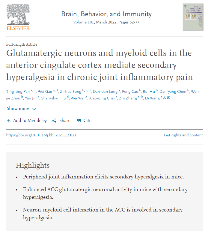 近日,我院麻醉科王迪团队与生命科学学院张智团队合作,在《Brain Behavior and Immunity》期刊(中科院1区,2021年影响因子:19.227)发表题为“Glutamatergic neurons and myeloid cells in the anterior cingulate cortex mediate secondary hyperalgesia in chronic joint inflammatory pain”的研究成果,深入揭示了关节炎相关的慢性疼痛发生的神经机制。