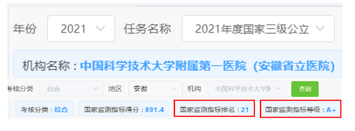 9月30日上午,国家卫生健康委公布2021年度三级公立医院绩效考核国家监测指标考核结果,在全国三级综合性医院中,中国科学技术大学附属第一医院(安徽省立医院)位列21位,连续四年考评等级为A+,继续领跑安徽。2021年度医院四级手术人数全国第8位,科研经费总额全国第28位,技术难度(CMI)全国第32位。