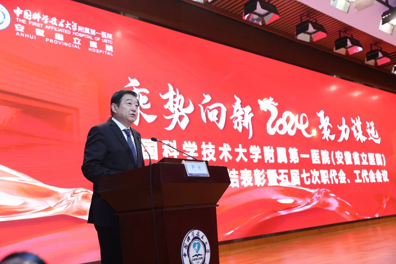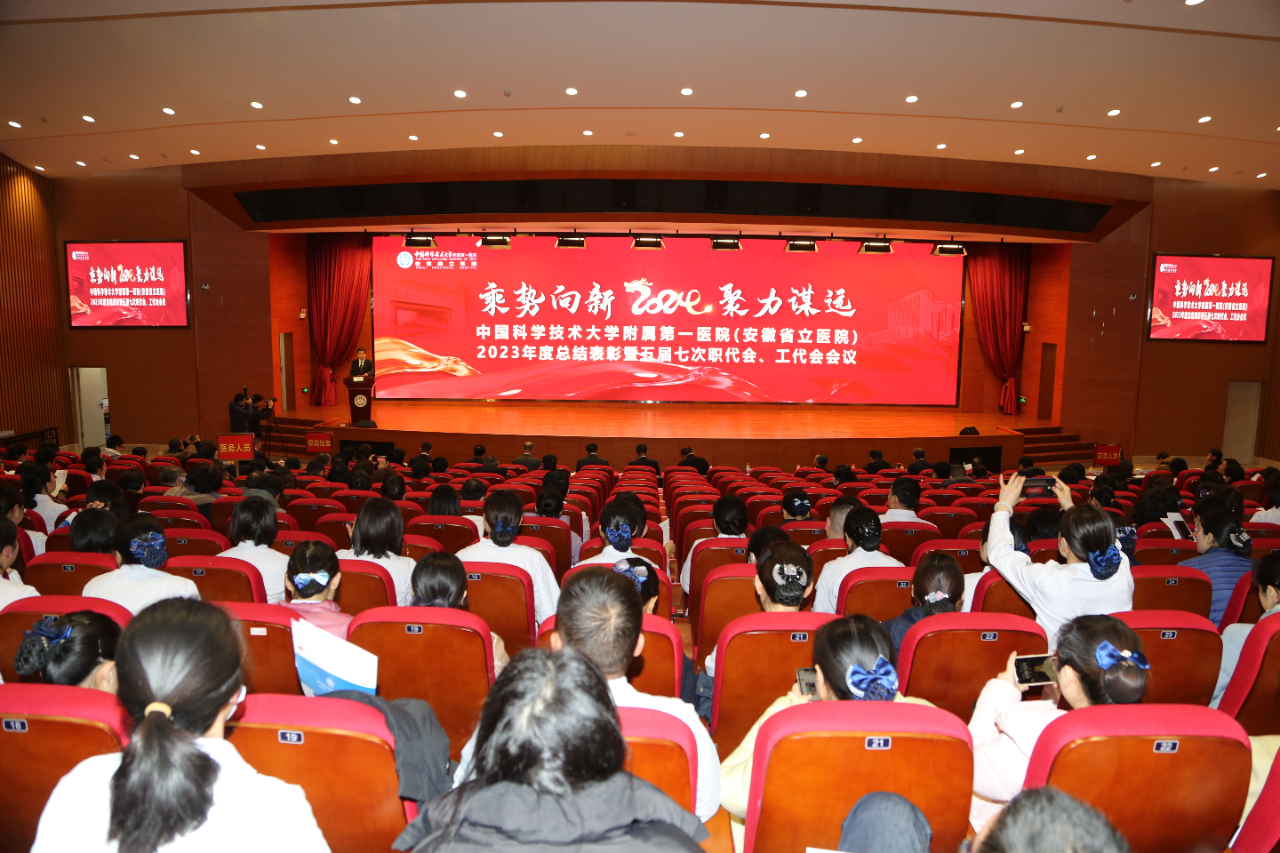 1月23日上午,中国科大附一院(安徽省立医院)2023年度总结表彰暨2024年工作部署大会召开,五届七次职工代表大会、工会会员代表大会同步召开。医院党政领导班子,科主任、护士长、职能部门负责人,先进集体和先进个人获奖代表、职代会和工代会代表参加大会。大会在校院融合六周年专题片中拉开帷幕。