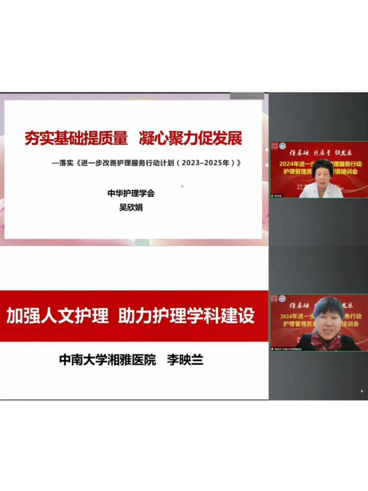 本次会议以“强基础 提质量 促发展”为主题,围绕国家卫生健康委《进一步改善护理服务行动计划(2023-2025)》具体内涵和要求,邀请中华护理学会理事长吴欣娟,中南大学湘雅医院护理工作指导委员会副主任委员李映兰等进行主题授课。