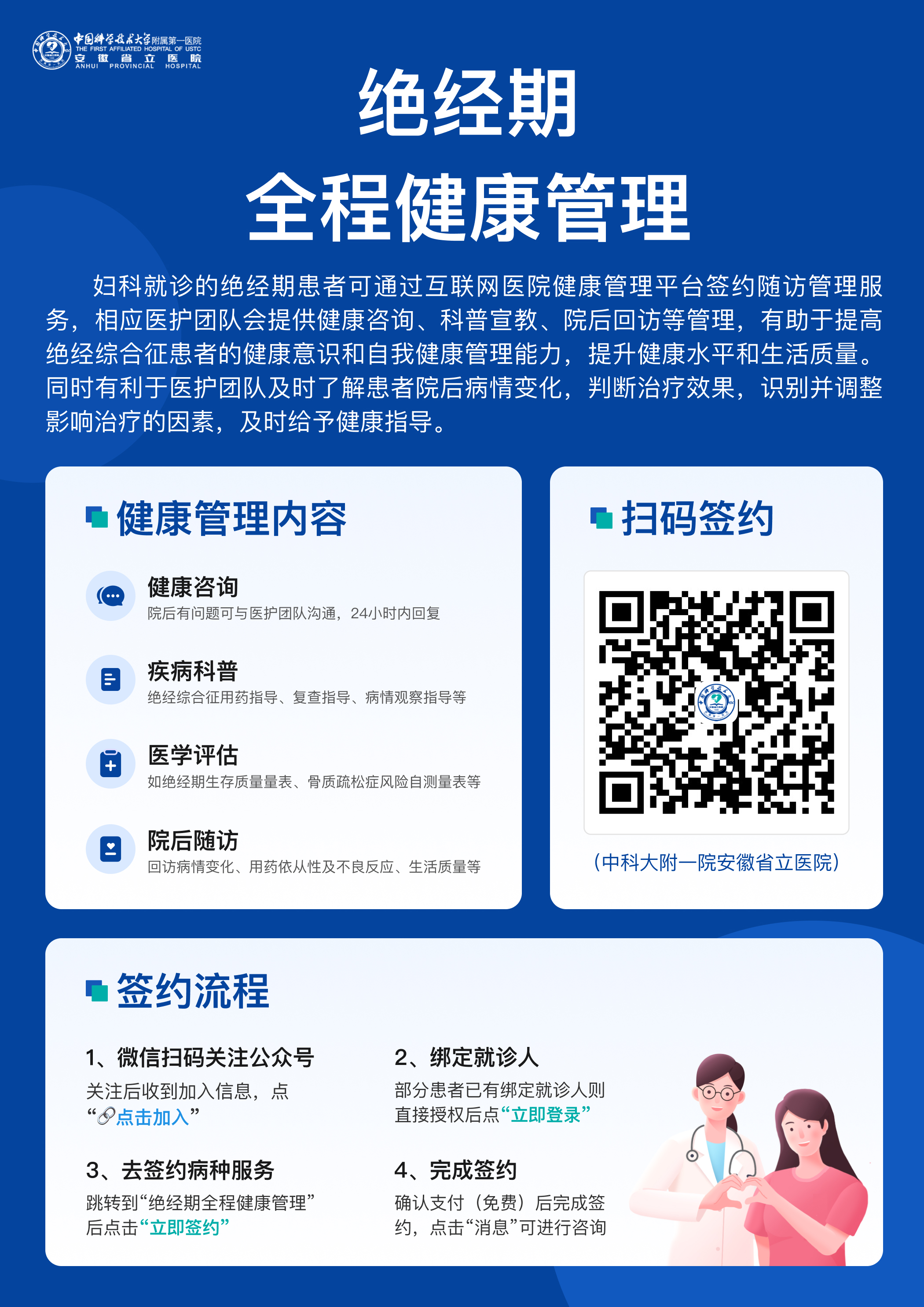 此外,医院开展了绝经期全程健康管理,绝经期女性可通过中国科大附一院互联网医院健康管理平台免费签约随访管理服务。