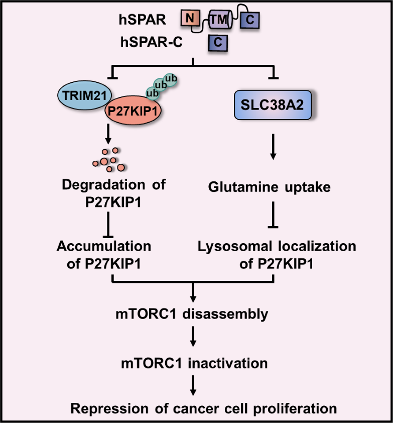 在本项工作中,研究人员证明hSPAR具有抑制乳腺癌细胞生长和增殖的抗肿瘤效应。利用乳腺癌细胞和小鼠移植瘤模型,该研究进一步证明了hSPAR通过协同促进P27KIP1的表达和溶酶体定位而抑制 mTOR信号通路的分子机制。