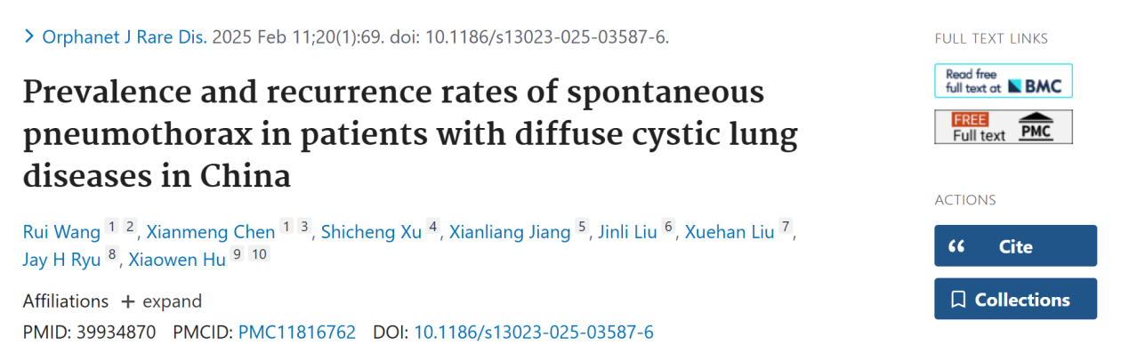 自发性气胸是临床常见的急症之一,可发生于弥漫性囊状肺疾病(DCLDs)患者。此前,国内外尚未有研究能够明确DCLDs患者中的气胸发生与复发的风险如何,不同疾病类型是否影响气胸治疗方案等。近日,我院呼吸与危重症医学科胡晓文团队于国际罕见病孤儿杂志《Orphanet Journal of Rare Diseases》发表了最新研究《中国弥漫性囊状肺疾病患者自发性气胸的发生率和复发率》,首次在国际上系统揭示了DCLDs患者气胸的患病规律与复发风险,为临床诊疗提供了重要依据。
