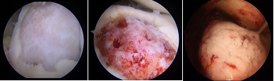 镜下软骨缺损区域——软骨缺损区域清创+微骨折术——镜下局部注射胶原蛋白软骨修复支架