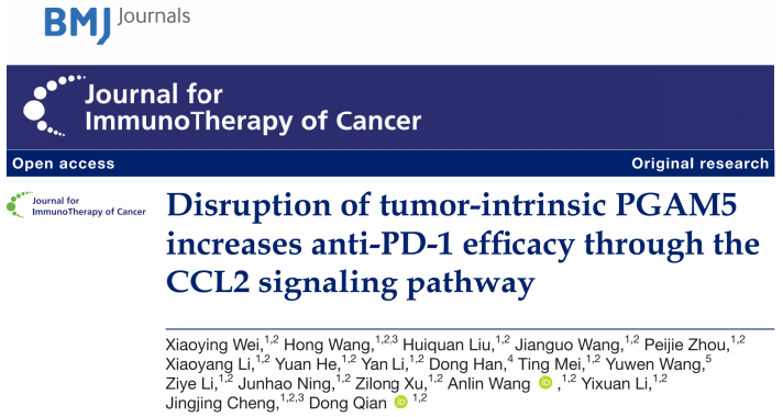 近日,我院肿瘤放疗科钱东教授团队研究发现线粒体蛋白PGAM5通过稳定线粒体分裂关键动力蛋白DRP1,促进线粒体分裂和线粒体DNA向胞质释放,进而激活下游炎性通路,介导肝癌免疫微环境中巨噬细胞的促肿瘤极化,靶向抑制PGAM5可重塑肝癌免疫微环境,显著增强免疫检查点抑制剂的疗效。该研究成果“Disruption of tumor-intrinsic PGAM5 increases anti-PD-1 efficacy through the CCL2 signaling pathway”于2025年1月7日在线发表于BMJ子刊/国际癌症免疫治疗协会(SITC)专刊《Journal for ImmunoTherapy of Cancer》。该研究为肝癌免疫治疗的增效及联合策略提供了新思路。