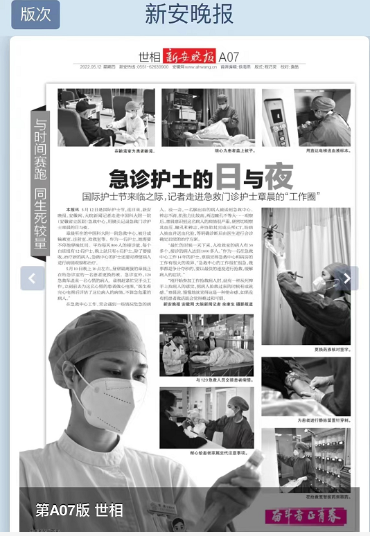 本报讯5月12日是国际护士节,连日来,新安晚报、安徽网、大皖新闻记者走进中国科大附一院(安徽省立医院)急救中心,用镜头记录急救门诊护士章晨的日与夜。