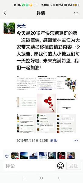 “今天是2019年快乐糖豆群的第一次微信课……愿我们的大小糖豆们每一天控好糖,未来充满希望,我们一起加油!”翻开郑茂的朋友圈,动态并不是很多,但每一条都被“疯狂”点赞。“他们大部分都是我的患者,还有很多是患儿家长。”郑茂坦言,对于大多数年幼的1型糖尿病患者来说,因为身患隐疾,很多隐忧是外人难以感受和理解的。因此,她习惯称呼患儿们为“糖豆”,希望在治疗疾病的同时能多带给他们一些快乐。