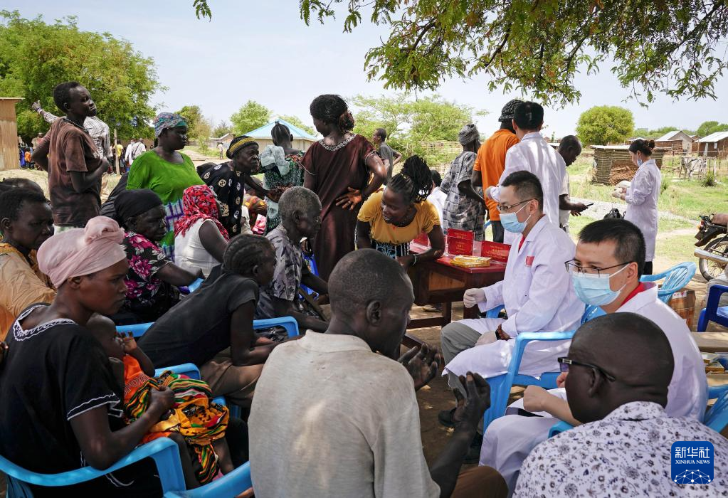 4月10日,中国援南苏丹医疗队医生在南苏丹首都朱巴西南的纳基图恩村为村民义诊。