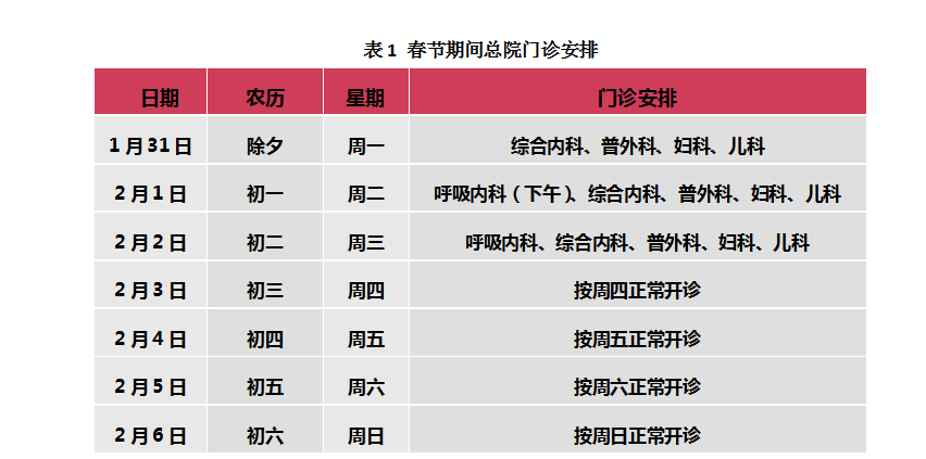 1月31日-2月2日(除夕至初二),总院和南区开设综合内科、普外科、妇科、儿科门诊,呼吸内科初一下午起开诊;西区门诊停诊