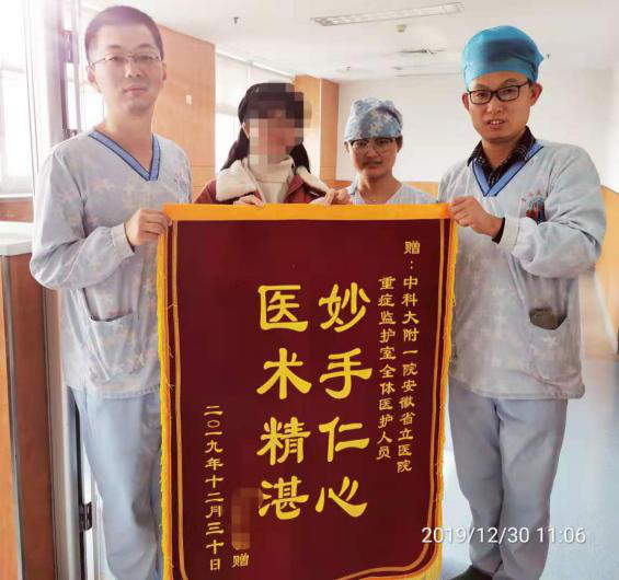 时间转眼间到了12月,外面的温度冷的让人在家不想出门。重症医学科的医生与护士们仍然坚守在自己的岗位上,关爱着他们心中最牵挂的病人。此时一个年轻的小姑娘带着一个包裹来到了病房,对医生与护士说了句“我是小小,谢谢你们救了我,给了我第二次生命”,说完打开了包裹,是一个大大的锦旗,“医术精湛、妙手仁心”印在当场所有人的心中,最后留下了这张照片。