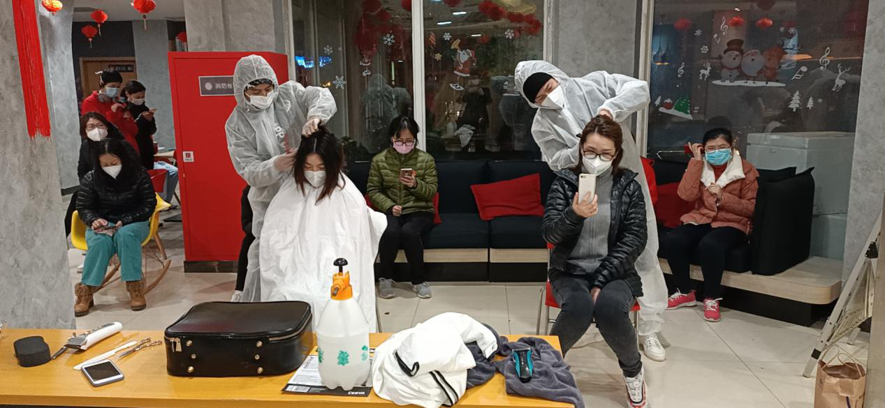 因为工作的原因,大家需要轻装上阵,很多女生减去了长发,男生剃了寸头。虽然没有理发店开门,但是得知我们的需求后,理发师们自愿上门免费为我们理发。