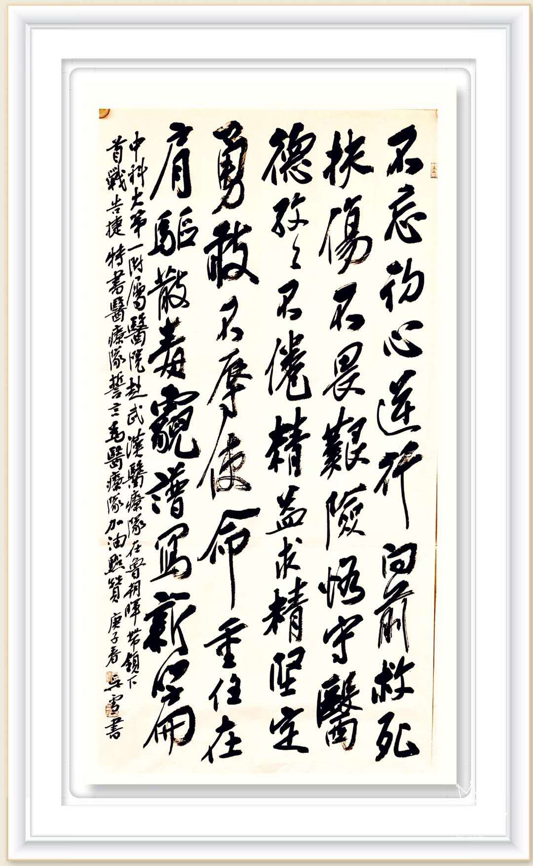 近日,我们收到了安徽省书法家协会主席吴雪为支援湖北医疗队的亲笔题词,“不忘初心,逆行向前;救死扶伤,不畏艰险;恪守医德,孜孜不倦;精益求精,坚定勇敢;不辱使命,重任在肩,驱散毒霾,谱写新篇”。我坚信,有这么强大的力量作为后援,我们前线战士是可以做到的。