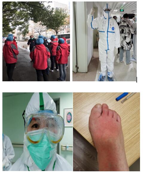 抗疫工作是异常地艰辛,对于医务人员更是对勇气和体力巨大的考验,无论是在体力上、专业上,还是精神上。她所在的医疗队整体接管了同济医学院附属协和医院的肿瘤中心一个64张床的重症病区,面对陌生的工作环境和工作流程,陌生的电脑操作系统,陌生的、既无影无踪又如影随形的病毒,从专业的护理工作到生活护理都是由护理人员承担,巨大的工作量,让人心神疲惫;但患者殷殷期盼的眼神,求生的欲望,让她们无法退缩,无所畏惧。她又是本次医疗队的护理组长,必须要身先士卒,合理安排人员、有序地救治病人,让所有护士与医生紧密配合;她所带领的第三小组,自称为“第三战队”,她对队员们关爱有加,她们团结、互助,努力完成自己的工作,每个班次排班是6小时,提前更换防护服以便能准时接班,这要提前1小时到医院,下班时她不忍心把自己的工作交到下一班,往往要推迟下班,还要脱下防护装置,这样按出入酒店时间算起,有10个小时之久。来武汉之前,她每天都能从中央电视台的节目中看到有关医护人员辛苦工作的报道,通过一轮班上下来,她才真正有了更深的体会,10个小时不吃不喝、不上厕所,可以忍,脸颊、鼻梁、耳朵被压伤也可以扛,戴口罩、穿防护服闷热出汗,她们还可以坚持,皮肤过敏起湿疹也在可以顽强地耐受;唯一不能忍受的是那护目镜满是雾气的情况下还要进行精准操作,这实在太难了。一边是病人看不见摸不着的血管,一边是满满几大试管架的抽血试管,还有病人对你“一针见血”的期盼的表情,这一切都需要我们透过朦胧的护目镜去完成,操作不顺利痛的是病人,难受的是她的心。如何去避免针刺伤自己?说实话,她也不知道!她几乎没有考虑过这个问题。工作过程中类似的例子还有很多。