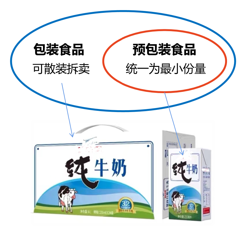 举个例子:我们去超市购买包装的纯牛奶,买一箱为包装食品,买一瓶则为预包装食品。预包装食品是包装食品中的最小份量。