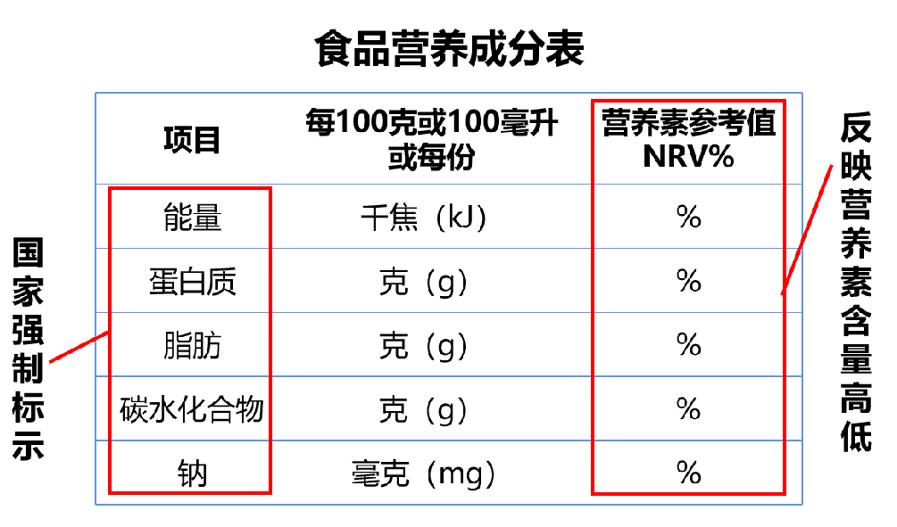 营养成分表:标注营养成分名称、含量和占营养素参考数值(NRV)百分比的规范性表格。