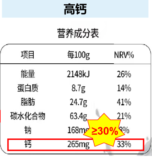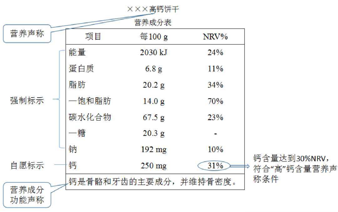 如图所示“高钙”是营养声称,“钙是骨骼和牙齿的主要成分,并维持骨密度”就是营养功能声称。