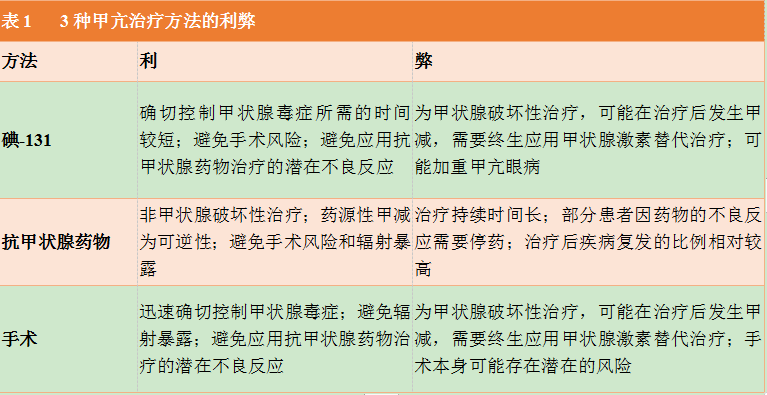 目前,针对甲亢的治疗方法主要包括碘-131治疗、抗甲状腺药物治疗和手术治疗,旨在降低甲状腺激素水平而非明确地针对病因,即3种方法均为对症性治疗而非根治性治疗,3种治疗方法的利弊可见表1。相对而言,碘-131治疗具有疗效确切、经济、方便、安全等优点,缺点是治疗后可能会出现甲减。在美国,80%的医生和患者首选碘-131治疗,并把治疗后甲减转归为治愈,国内多数医生和患者会顾忌碘-131治疗后甲减。而事实上,碘-131治疗后甲减并不可怕,尤其是当患者存在严重甲亢并发症如甲亢心、肝功能损害等时,碘-131治疗的目标就是甲亢治愈后的甲减,患者因此而获得的收益要远远大于甲亢并发症带来的严重损伤。成为甲减后的治疗只需要补充适量的甲状腺激素(医学称之为“替代治疗”),也就是所谓的“缺什么补什么、缺多少补多少”,可迅速控制病情,获得满意的疗效。相对于抗甲状腺药物存在副作用(约1/3的患者可能会引起白细胞减低、肝功能损害及皮肤过敏等),以及另外一种治疗甲减的药物—左旋甲状腺素则安全的多,孕妇亦可服用。