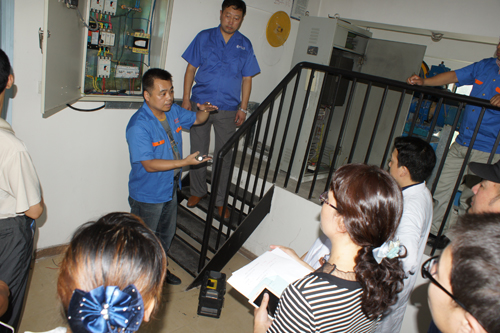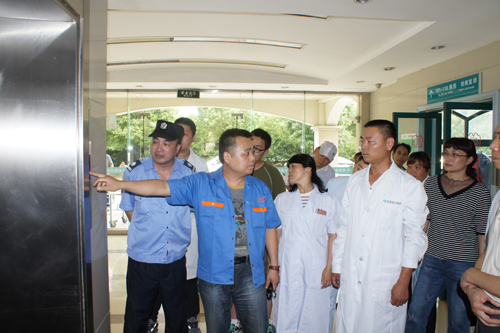 下午3点,电梯应急救援演练正式开始。医院一部医用乘客电梯模拟突然出现故障,造成电梯停止运行,2名乘客被困电梯里。乘客立即按下了电梯内的报警按钮并和电梯安全管理人员进行联系,电梯安全管理人员接到报警后,一边安抚“被困”电梯内的乘客,并迅速通知了电梯维保单位。电梯维保专业人员接到通知后,迅速做出反应,采取措施进行救援。随后,电梯维保人员对该电梯进行了全面检查。演练中,维保单位在规定时间内,迅速、规范、成功的解救被困乘客。从乘客报警到成功解救历时25分钟,达到了演练预期的效果。