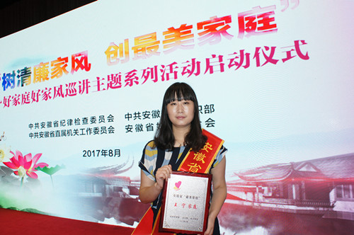 8月23日上午,在合肥市稻香楼宾馆举行的“树清廉家风,创最美家庭”暨好家庭好家风巡讲主题系列活动启动仪式上,安徽省妇联黄红主席亲手将安徽省“最美家庭”奖牌颁发给石玉如。