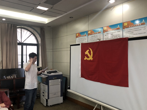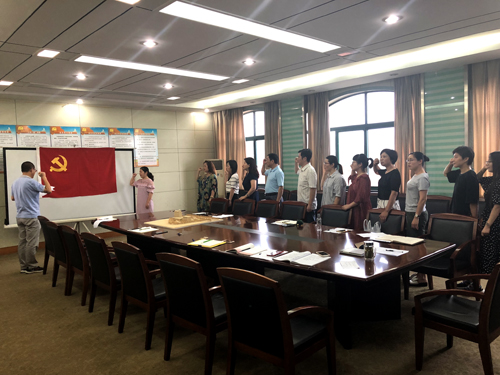 在鲜红的党旗下,今年初加入中国共产党的傅晓霖同志举起右手,在领誓人张劲松带领下,向党旗庄严宣誓。与会党员共同举起右手,面向党旗,再次重温了入党誓词。