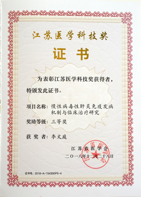 我院三病区在2016年获得安徽省科技进步奖(Pygo2介导的Wnt信号通路在肝纤维化中的作用机制及其临床应用)的基础上,近日,再次获得2018年江苏省医学科技奖(慢性病毒性肝炎免疫发病机制与临床治疗研究)。