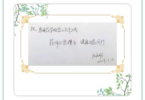 张良明院长为“感院药学”公众号的上线寄予了殷切的期望:“药师与您携手,健康与您同行!” 以患者为中心,以微信为载体,积极创新药学服务模式,努力提升药学服务质量,我们感院药师全体同仁,将继续坚持“以药为器,用心服务”的服务理念和“以人为本,厚德载物”的人文理念,为患者提供更好的药学服务。